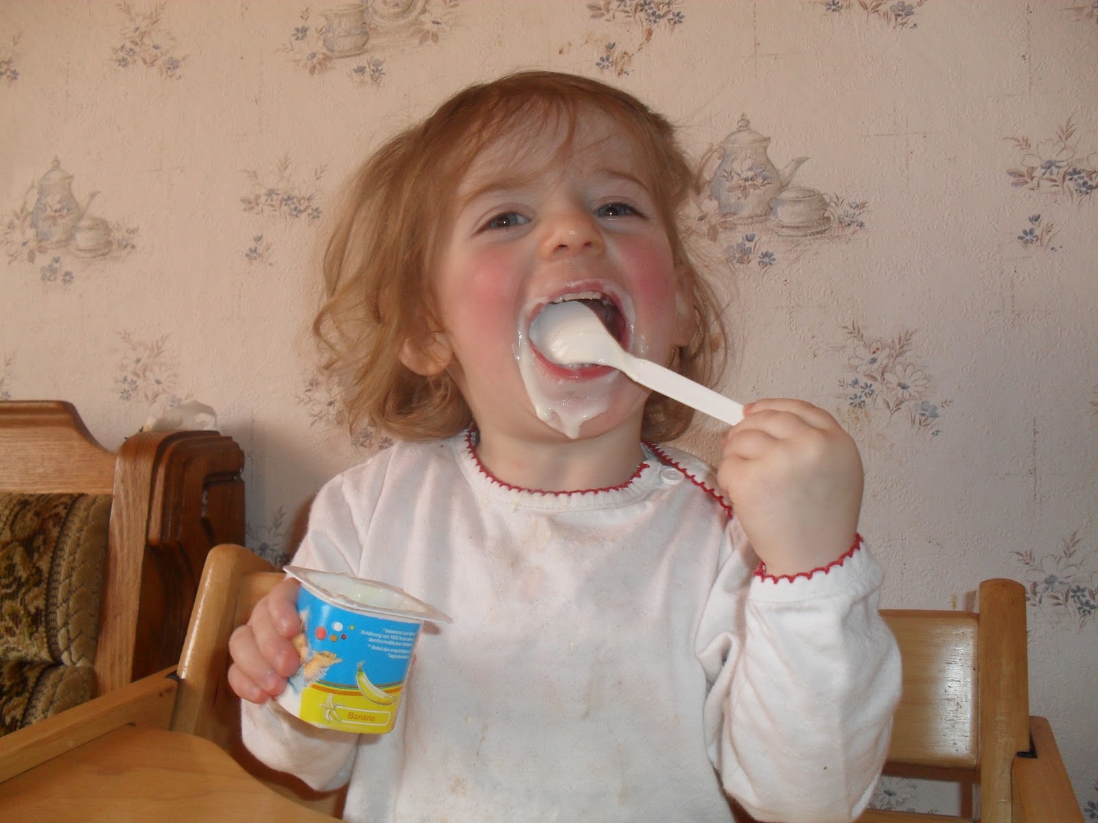 Nun hat sie entdeckt, das es vielmehr Spaß macht alleine zu löffeln und fordert dieses „Recht“ darauf auch lautstark ein. Und wie heißt es so schön “ Learning by doing“ lasse ich sie gewähren und freue mich mit ihr über die Freude die sie dabei hat es selber zu machen !