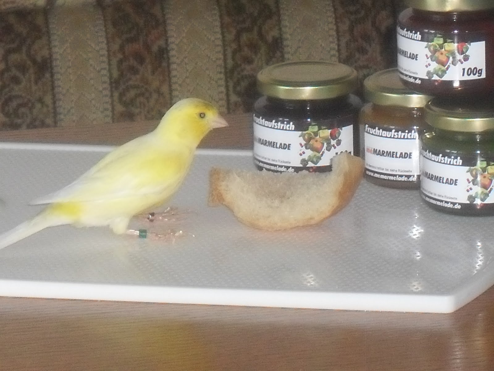 Da wir nicht nur ein Häuschen gemietet haben, sondern den Kanarienvogel der hier wohnte gleich mit, habe ich ein Bild von unserem Birdie gepostet, wie er auf einem Brettchen sitzt und am Brötchen pickt. Birdie ist nämlich ein ziemlich verfressenes Exemplar, sobald er sieht das es Brötchen gibt, fliegt er mit Anschwung auf das nächst freie Brettchen und läßt sich nieder ! Der Vogel weiß halt auch was gut ist ;o) Und wehe wir legen ihm nicht ein Stückchenhin, dann piepst und fliegt er so lange um uns herum bis er bekommt was er will :o)